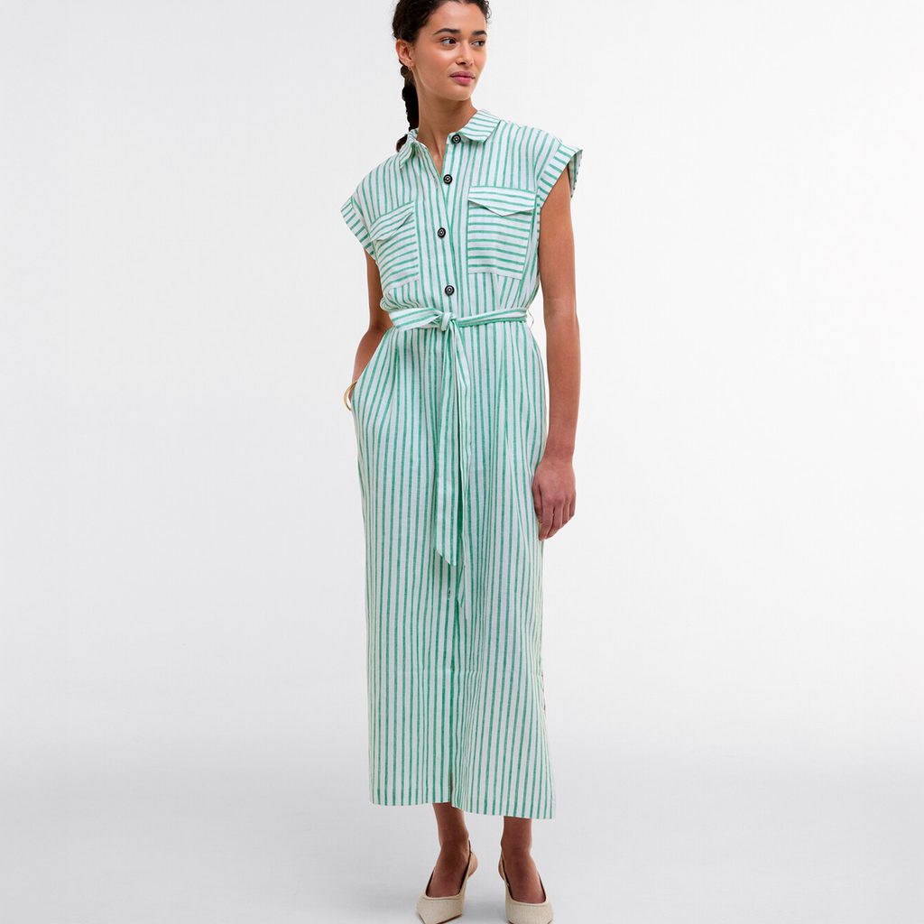 U ovoj kolekciji, Abby haljina izrađena je od ugodno ljetne mješavine pamuka i lana u bijelo-zelenim okomitim prugama, koje se prelaze u vodoravne samo na džepovima i ovratniku.
