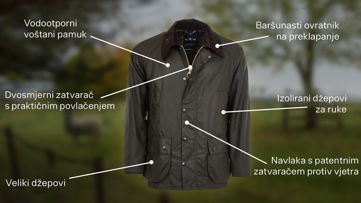 Kompaktna zimska jakna u kojoj vas prirodni elementi ni modna policija neće iznenaditi. Proizvedeno od klasičnog voštanog pamuka , s mat obrađenom površinom, izduženog, ali još uvijek ugodnog kroja. Ima klasičan obostrani patentni zatvarač skriven pod kopčanjem na gumbe, elegantan samtasti ovratnik, dva prostorna vanjska džepa za nužne stvari te dva ugodna podstavljena džepa za zagrijavanje ruku.
