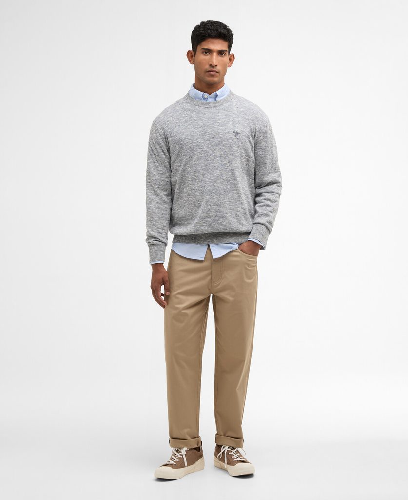 Barbour Flaxby je lagani pleteni džemper od mješavine lana i pamuka. Melirana pređa daje mu zanimljivu, nepravilnu teksturu – na fotografijama izgleda kao melir, dok se uživo više vidi struktura pletiva. Laneni udio osigurava prozračnost i ugodan, blago rashlađujući osjećaj na dodir, pa je to više proljetno-ljetni komad nego klasičan topli džemper. Kroj je udoban i ravan te odlično funkcionira preko košulje – kao što možete vidjeti na fotografiji.