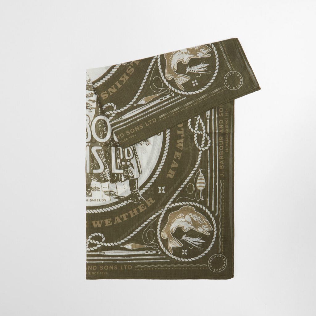Pamučna marama, odnosno bandana, s motivima iz Barbour arhive. To znači muhe, patentne zatvarače, drukere, ribe, ali i Barbour vosak. Svaka varijanta boje ima vlastiti uzorak, pa je proljetna kolekcionarska opsesija već jasna.