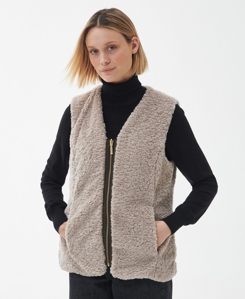 Prsluk s klasičnim Barbour dijamantnim šavovima i pozlaćenim patentnim zatvaračem. Dva otvorena džepa omogućuju jednostavan pristup svim sadržajima, ali služe i kao mjesto za grijanje ruku