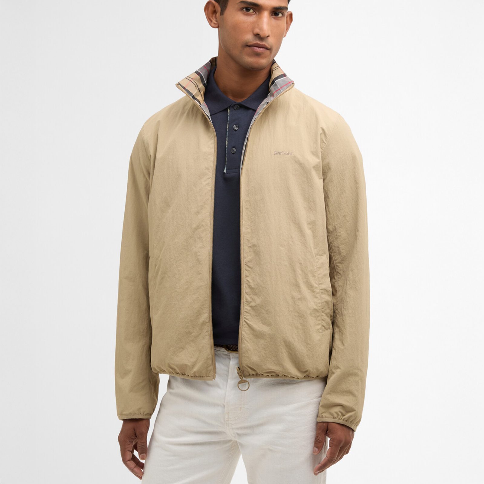 Barbour Korbel je lagana proljetna jakna od poliamida s vodootpornom obradom, koja se može nositi s obje strane – jednobojna strana funkcionira kao čist i neutralan temelj za bilo koji outfit, a okrenuta tartan strana kao izražajnija varijanta. Kroj je kraći i opušteniji, s elastičnim donjim porubom i manžetama od lycre, pa udobno sjeda i preko pola ili laganijeg džempera. Ima kopčanje na patentni zatvarač, a sa strane klinaste džepove.