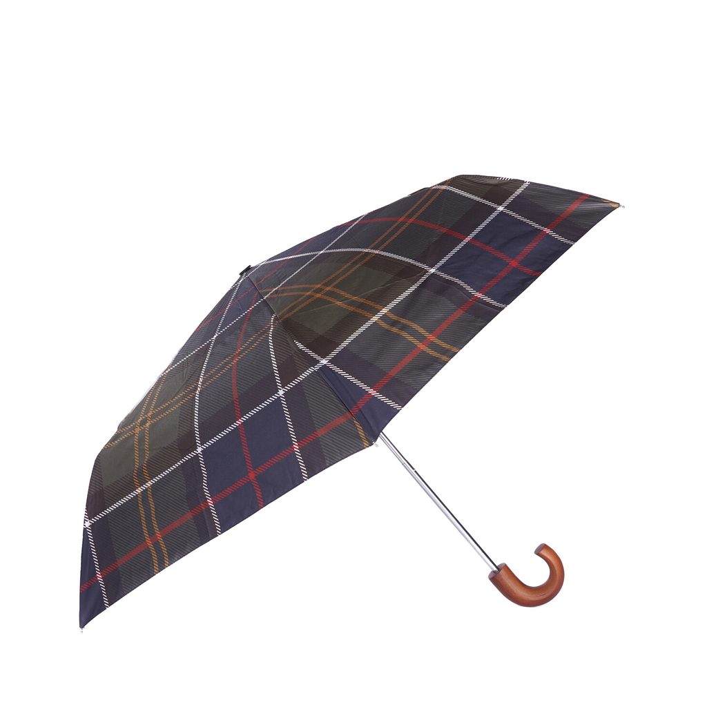 Crveno-plavi tartan sklopivi kišobran iz radionice engleskog Barboura s elegantnom drvenom drškom. Dolazi u praktičnoj torbici.