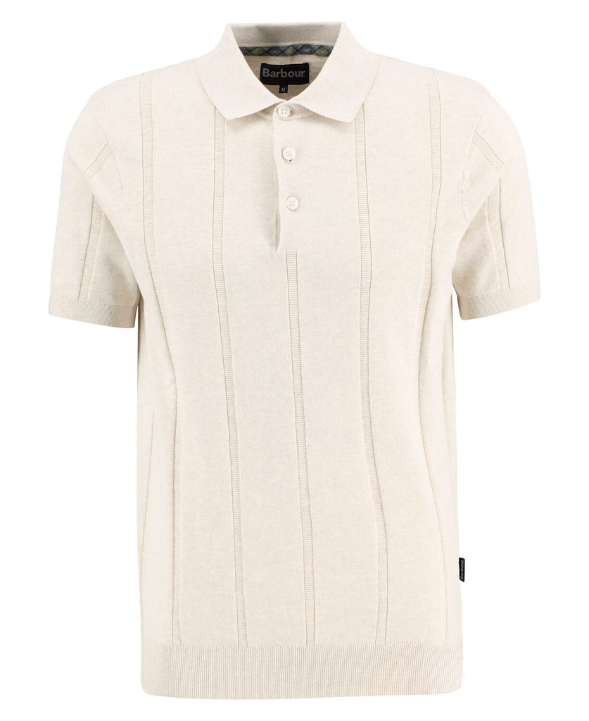 Barbour Wellburn je pleteni polo od pamuka, finoće 12GG – dakle glatko, tanko pletivo, a ne gruba pletenina. Okomite pruge u uzorku su ton u tonu, u istoj boji, samo u drugačijoj vrsti pletiva, pa dodaju teksturu bez toga da polo djeluje “napadno” uzorkovano. Kroj je pripijeniji, kratki rukavi s rebrastim rubom, a i ovratnik je rebrast. Na lijevom bočnom šavu nalazi se tradicionalna Barbour zastavica.