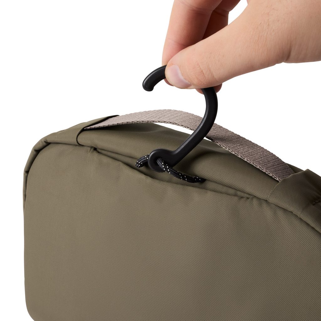 Revolucija se događa i u svijetu toaletnih torbica. Bellroy viseća toaletna torbica savršeno će se uklopiti gdje god situacija to zahtijeva. Zahvaljujući uvlačivoj aluminijskoj kuki (ne plastičnoj), torbu možete objesiti na ljestve, vrata ili paravan. Ako ga ne trebate vješati, jednostavno zakačite kuku u odjeljak i postavite torbu samostalno.