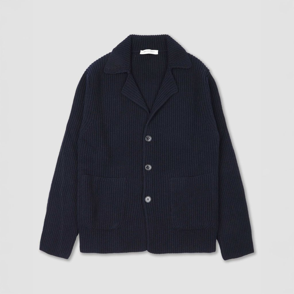 Pleteni blejzer brenda Brooksfield u tamnoplavoj boji, izrađen od kombinacije vune i poliamidnog vlakna. Pleten tehnikom polovičnog engleskog boda, ovaj model spaja izgled pletenine s elegantnim krojem. Šire kvadratne džepove, klasično kopčanje na gumbe i čist, jednobojni dizajn čine ga prikladnim i za formalnije prilike i za chic ležerne kombinacije.
