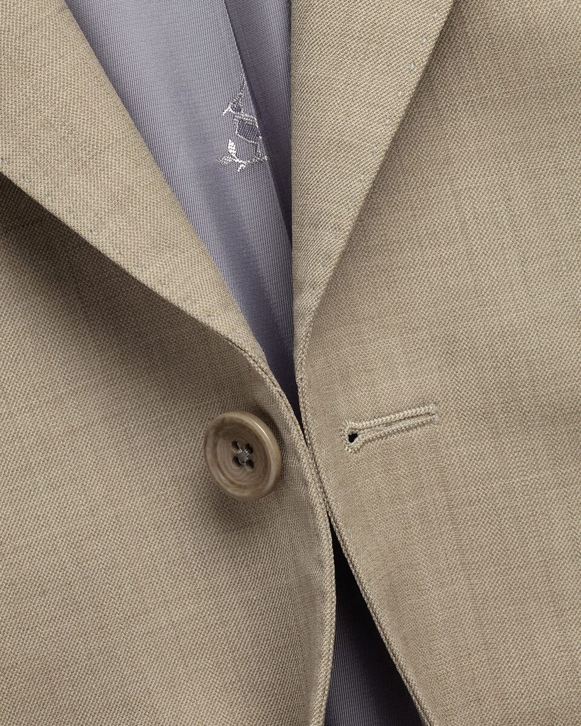Sako ima blago strukirani kroj, a konstrukcija s polutvrdim uloškom sprijeda osigurava formu i istovremeno prirodan pad. Vuna ima prirodni stretch i dobro se oporavlja od gužvanja. Na detaljima se vidi briga o cjelini: AMF štep duž revera, ovratnika i preklopa džepova, četiri funkcionalna gumba na manžetama (2×4) od tzv. biljne bjelokosti (tagua oraščića), džepovi za ruke te upečatljiva podstava s motivom čejki – tradicionalnim znakom ove marke.