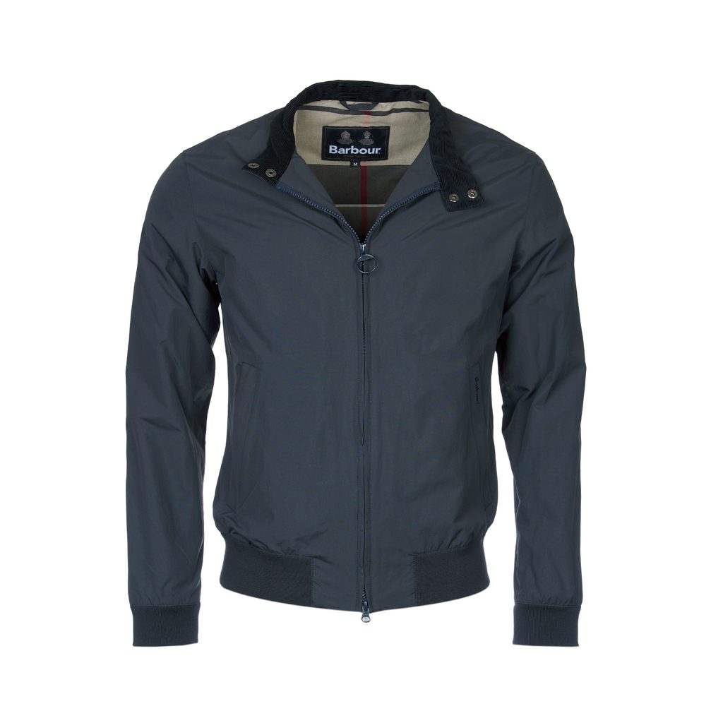 Lagana jakna Barbour Royston sportskog kroja s dvosmjernim zatvaračem, ovratnikom na kopčanje s postavom od samta, rebrastim manšetama i rubom, dva bočna džepa i sa bitnim detaljima od tartana.