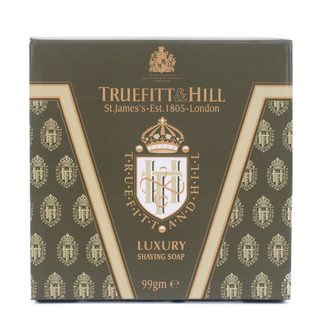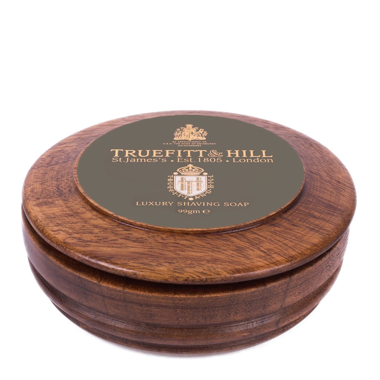 Luksuzan engleski sapun za brijanje tvrtke Truefitt & Hill u ništa manje luksuznoj drvenoj posudi od ulaštenoga drva.
